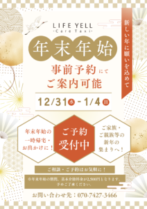 年末年始の12月31日(水)〜1月4日(日)の期間中、事前予約制にてご案内可能です。年末年始での一時帰宅やご家族・ご親族等での新年の食事会等への移動手段として、福祉タクシーのご利用はいかがでしょうか。もちろん、他のご予定 […]